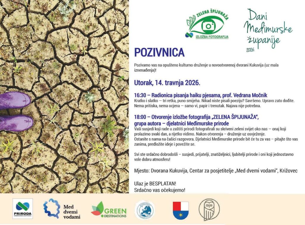 Svečano otvorenje izložbe fotografija grupe autora – djelatnika Međimurske prirode održat će se u utorak, 14. travnja, s početkom u 18 sati u Dvorani Kukuvija Centra za posjetitelje Med dvemi vodami.