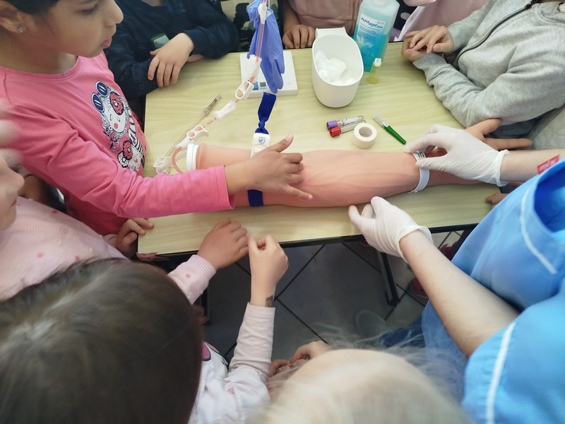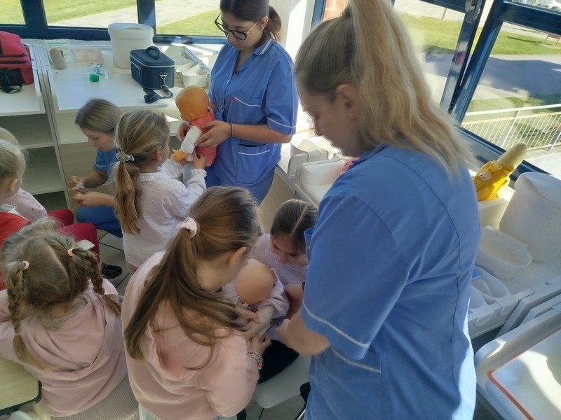 Kroz priče u školskoj knjižnici (biblioterapija), kroz toplinu riječi i zagrljaj slikovnica teme prilagođene upravo njima, strah se počeo topiti. A onda su na scenu stupili oni koji su tog dana bili – sve. Učenici koji nisu samo učili o zdravstvenim temama – nego živjeli želju za pomoć potrebitima Učenici 4.c i 5.c razreda, buduće medicinske sestre i tehničari, zajedno s budućim fizioterapeutima i učenicima njegovateljima (TES), preuzeli su ključnu ulogu. I nisu samo pokazivali. Oni su smirivali, objašnjavali, ohrabrivali. Oni su slušali.