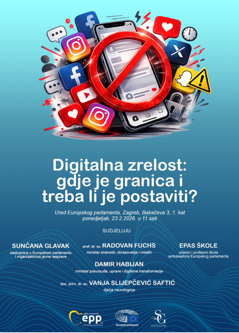 Zastupnica u Europskom parlamentu Sunčana Glavak organizira javnu raspravu s mladima pod nazivom “Digitalna zrelost: gdje je granica i treba li je postaviti?”, koja će se održati u Zagrebu (Ured Europskog parlamenta, Bakačeva 3, 1. kat), danas, 23. veljače 2026., s početkom u 11.00 sati.