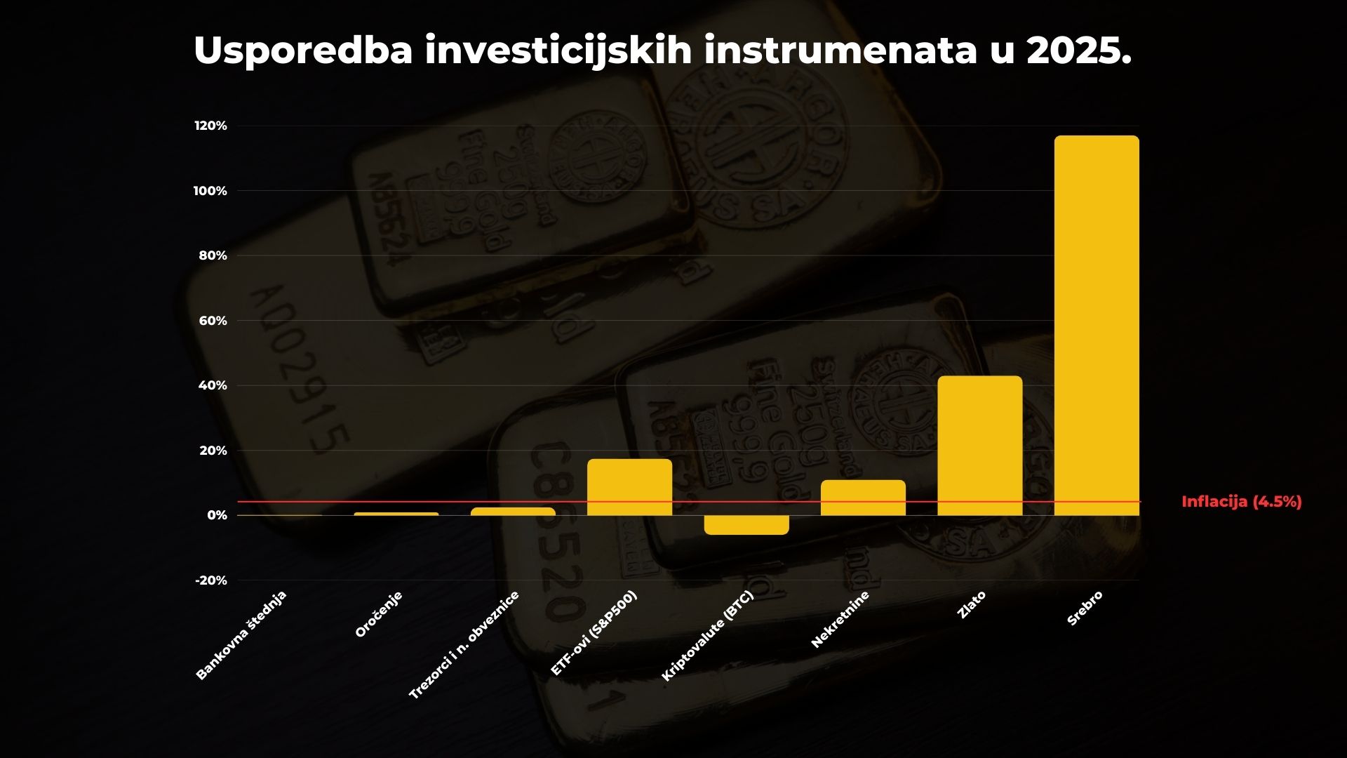 “Ulagači stoga sve češće pribjegavaju sigurnim utočištima koja štite vrijednost njihovog novca, u ovom slučaju zlatu i srebru. Riječ je o instrumentima niskog rizika koji su u posljednjih godinu dana, ne samo pobijedili inflaciju, već donijeli i pozamašnu zaradu svojim ulagačima. Cijena zlata u proteklih je 12 mjeseci porasla za više od 43%, dok je cijena srebra u istom periodu skočila preko 110%. Drugi ulagački instrumenti uglavnom se nisu mogli pohvaliti ovakvim rastom i tu činjenicu je sada prepoznao veliki broj investitora.”