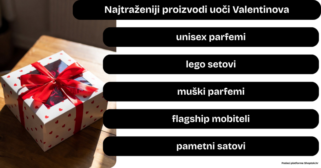 Među najtraženijim proizvodima ove su godine unisex parfemi, LEGO setovi, muški parfemi, Samsung Galaxy telefoni i pametni satovi. Parfemi se i dalje drže na vrhu ljestvice kao tradicionalni poklon za Valentinovo, osobito u cjenovnom rasponu od 30 do 100 eura, koji ostaje najstabilniji izbor za darivanje.