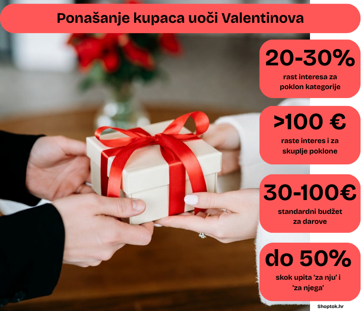Darivanje za Valentinovo očito se planira sve pomnije; statistika pokazuje da je već početkom veljače došlo do rasta od 20 do 30 posto u pregledima poklon-kategorija u odnosu na siječanj. Čini se da Hrvati sve manje čekaju zadnji trenutak te ranije istražuju i uspoređuju cijene prije nego što donesu odluku o kupnji, a najpopularnije kategorije pokazuju sve više varijacija.