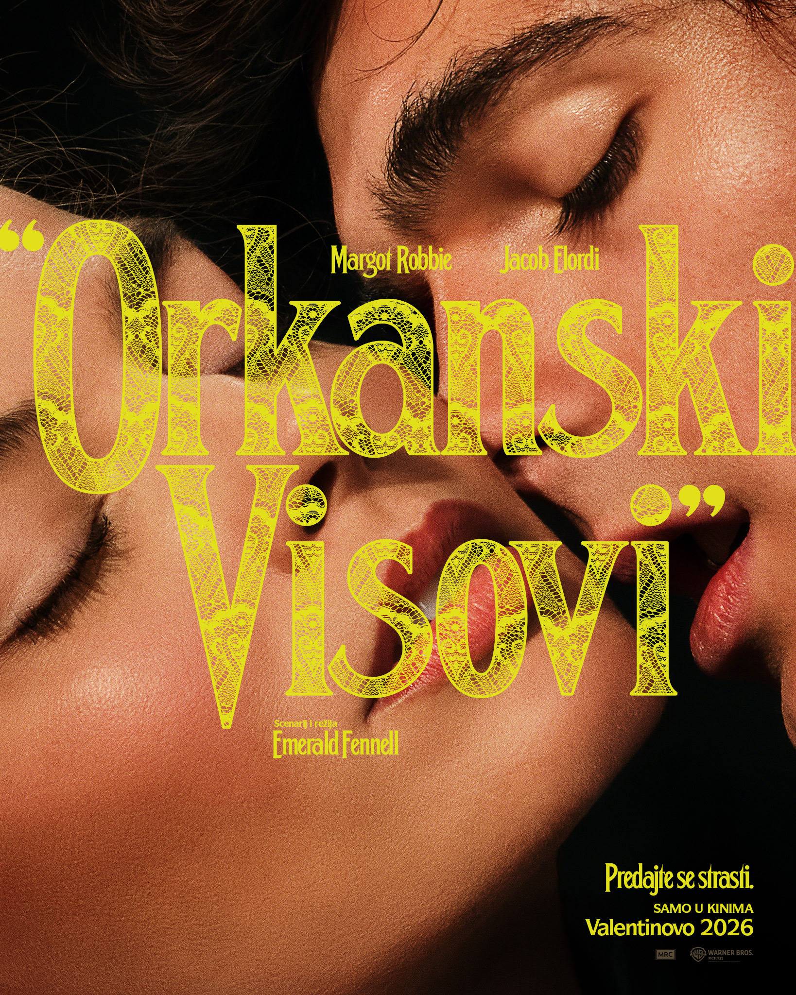 U središtu ove strastvene i vizualno raskošne adaptacije nalaze se dvije velike zvijezde današnjice, Margot Robbie u ulozi Catherine Earnshaw, donoseći liku sirovu energiju i emocionalnu eksplozivnost i Jacob Elordi kao mračni, neukrotivi Heathcliff, čija se enigma pretvara u pulsirajuću snagu priče. Njihova kemija dominira trailerom i najavljuje verziju priče koja je intenzivnija, hrabrija i senzualnija od prethodnih interpretacija.