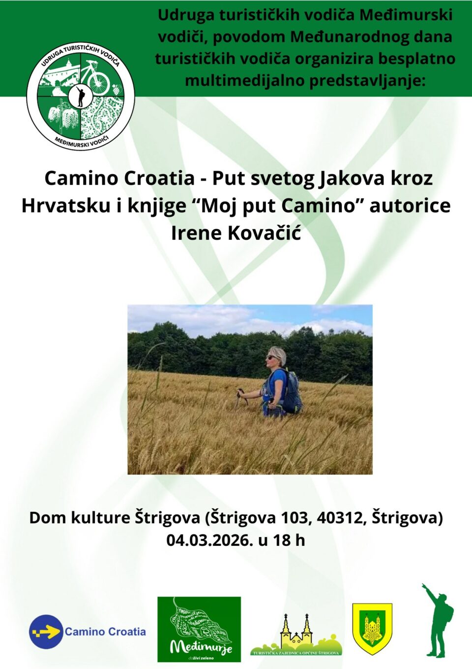 Multimedijalno predstavljanje projekta Camino Croatia – Put svetog Jakova kroz Hrvatsku te promocija knjige „Moj put Camino“ autorice Irene Kovačić održat će se ove srijede, 4. ožujka 2026. godine u 18 sati, u Domu kulture Štrigova. Organizator događanja je Udruga turističkih vodiča „Međimurski vodiči“.