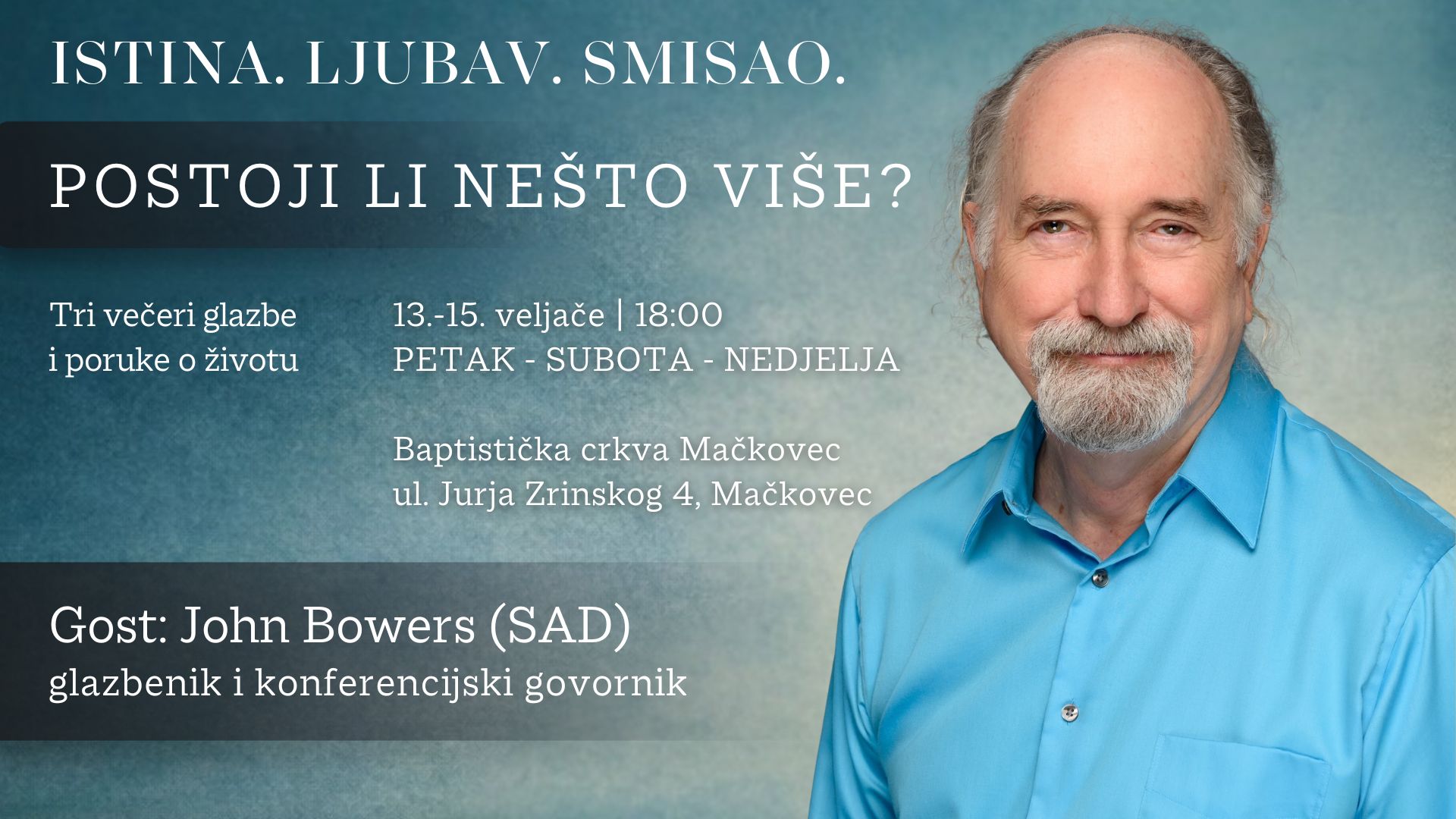 Gost programa je John Bowers (SAD), međunarodni konferencijski govornik i glazbenik s dugogodišnjim iskustvom javnih nastupa. Kroz svoj prepoznatljiv, pristupačan stil, Bowers povezuje osobne životne priče, glazbu i promišljanja o suvremenom načinu života, obraćajući se širokoj publici bez obzira na vjersku ili svjetonazorsku pozadinu.