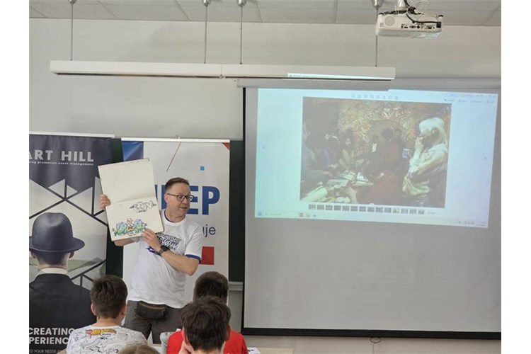 Potom je uslijedilo predavanje pod nazivom “Grafiti mogu biti umjetnost, a ne vandalsko ponašanje” koje je održao poznati umjetnik, grafiter Krešimir Golubić. U interaktivnoj radionici koju je vodio grafiter Golubić, tridesetak učenika 1.razreda naučilo je razliku između grafita, kao umjetničkog izraza i grafita koji se smatra vandalizmom. Kroz ovu radionicu učenici su uspješno savladali osnovne tehnike crtanja te stekli osnove pravilnog rukovanja bojama i sprejevima. Rezultat njihova rada je izrađen grafit s porukom “ZAJEDNO F ČAKOVCU”, koji je smješten ispred glavnog ulaza u školu.