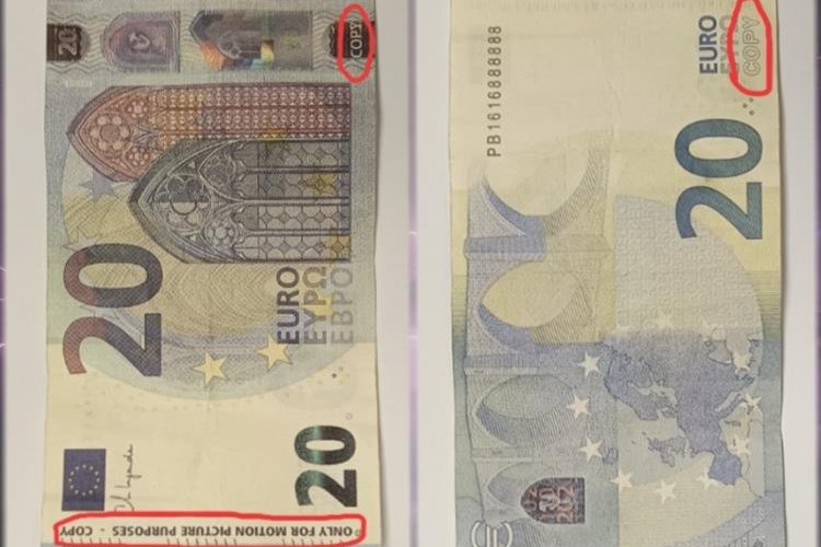 Novac koji se kao rekvizit koristi prilikom snimanja filmova, serija i sl., najčešće je izrađen od klasičnog papira. Kada takvu novčanicu uzmete u ruku, ona ne šuška kao prava koja je izrađena od specijalnog, pamučnog papira. Također, filmski novac nema zaštitnih obilježja, kao što su vodeni znak, zaštitna nit i slično. Više informacija o zaštiti i provjeri zaštitnih obilježja novčanica eura dostupno je na internetskim stranicama Hrvatske narodne banke i Europske središnje banke.
